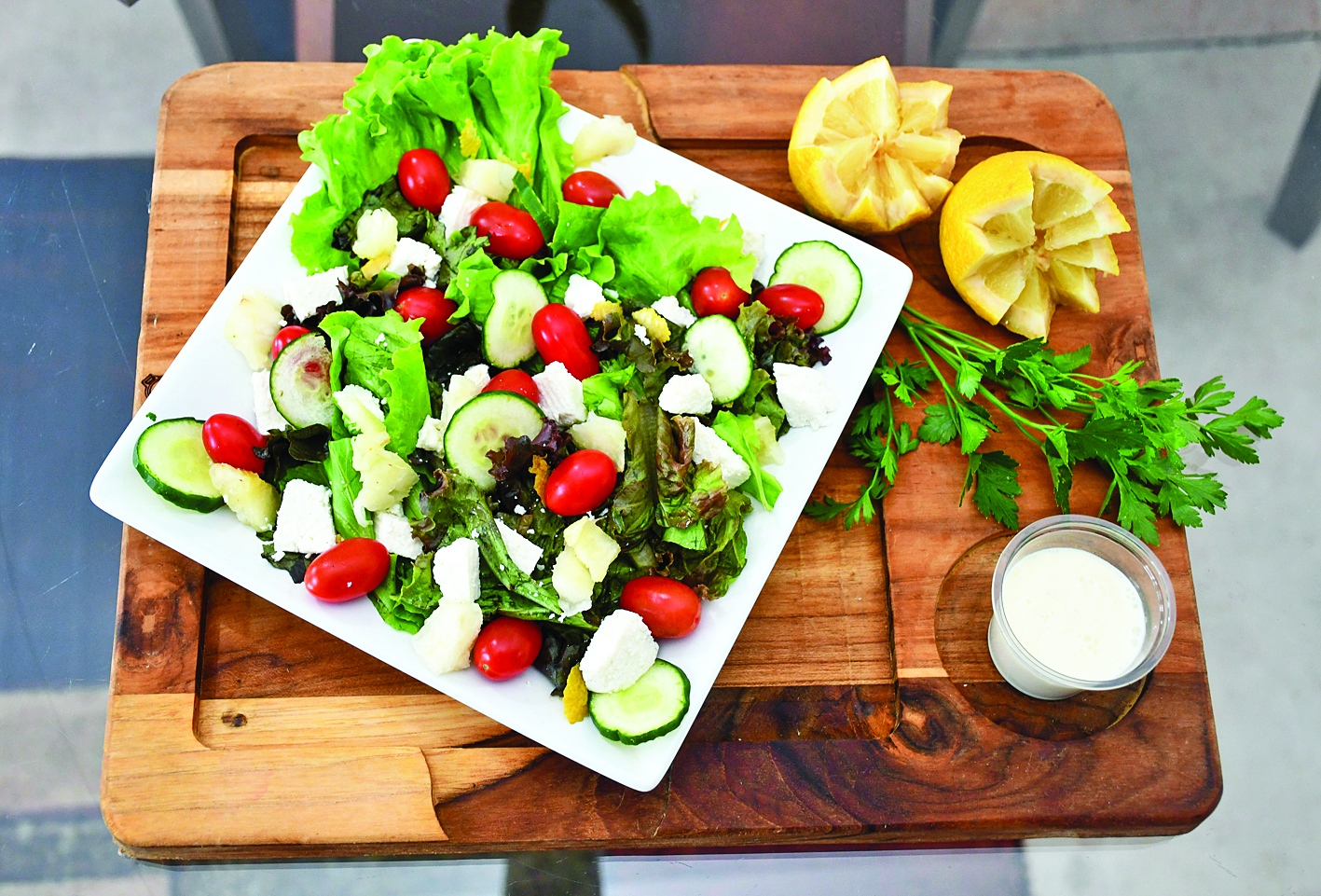 - Lave bem todas as folhas e misture todos os ingredientes, exceto as raspas de limão. Distribua as folhas rasgadas e misturadas em um prato apropriado para salada. Salpique o abacaxi e os tomates cortados ao meio. Disponha o queijo frescal ao redor do prato e salpique as raspas do limão siciliano. Regue com o molho na hora de levar à mesa.